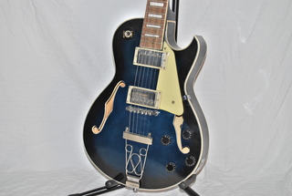 New Windaroo Custom Blue and Chrome Custom Hollow Body Electric Guitar, Gibson Style, 2 Double Humbucker Pick-Ups, 6-String, Right Hand, Maple Neck, Rosewood 22 Fret Fingerboard. Mother of Pearl Trapezoid Inlays, Double Siver Pick-Ups, 4 Volume / Tone Control Knobs, 3 Way Switch, Whammy Bar and a White Removable Pick Guard.
